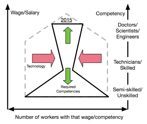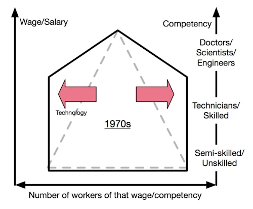 In the 1970s and 1980s, technology enabled the mid-range technician jobs to improve quality and productivity. Since, broadly, economies were growing, the number of people in this mid segment grew significantly.